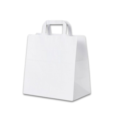 Τσάντα χάρτινη λευκή με φαρδύ χερούλι. Ιδανική για όλους τους επαγγελματίες της εστίασης για υπηρεσίες take away και delivery.